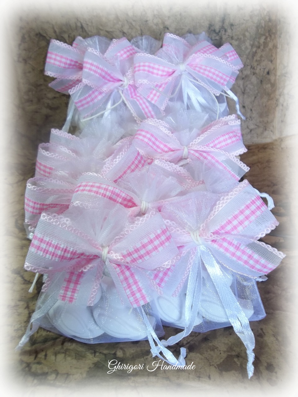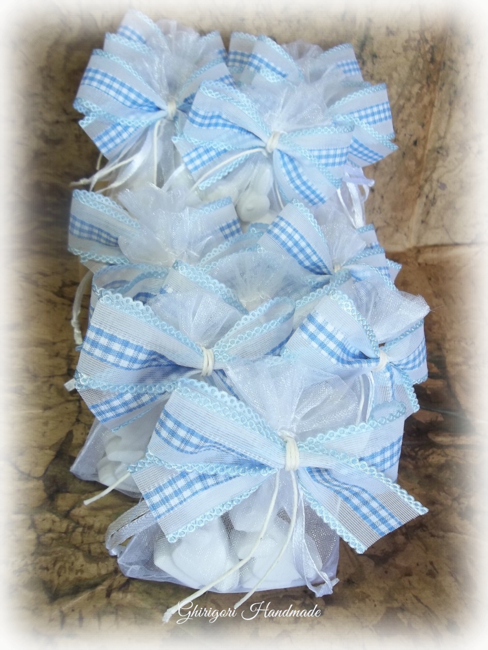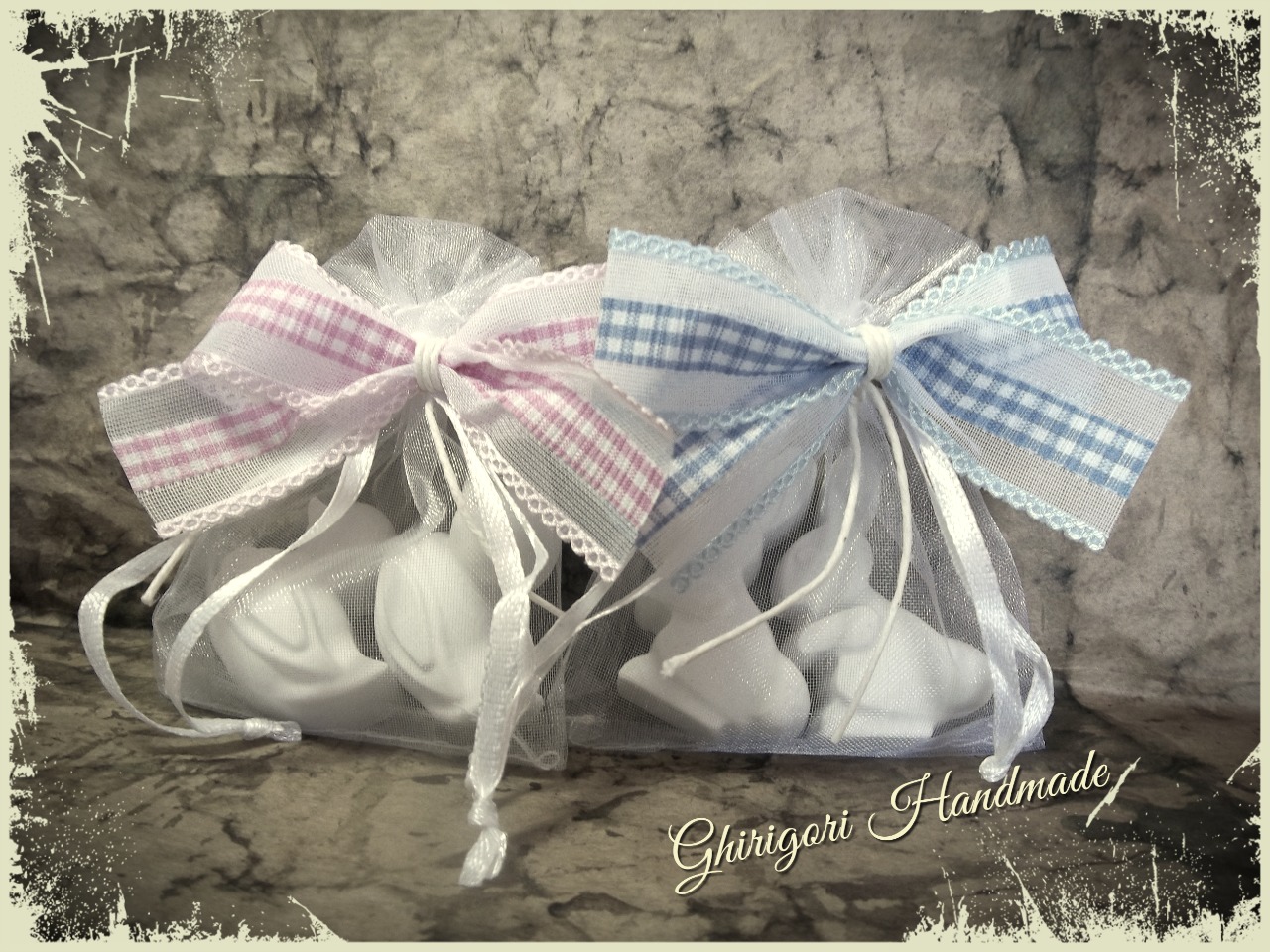 In un candido sacchettino d'organza, paperelle e coniglietti in gesso ceramico di alta qualità ed una delicata ma persistente essenza di talco.